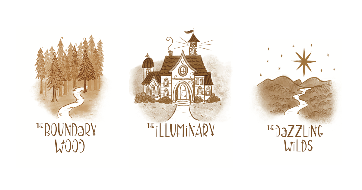 To enter the Illuminary, travelers cross the Boundary Wood, the threshold between everyday life and deeper creative attention. Beyond the Illuminary’s back gate stretches the Dazzling Wilds, the ever-expanding territory of new projects, questions, and possibilities.